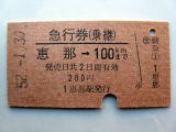 「急行券(乗継) 恵那→100KMまで」 (中央本線) 52.-1.30/200円券パンチ入 傷汚れなど有/状態優 |